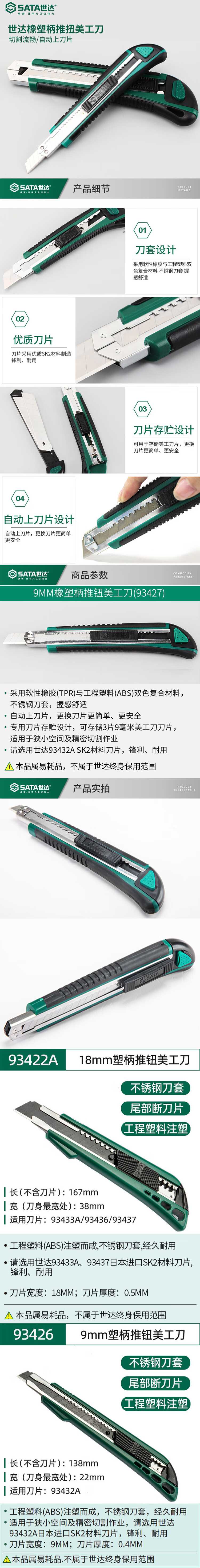 • 商品名称:世达/SATA 塑柄推钮13节9*80MM 车镗刀片 美工刀