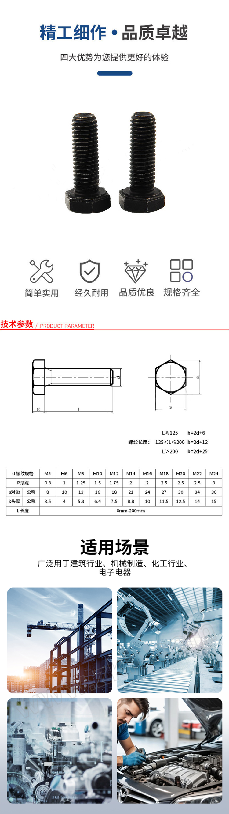 • 商品名称:天宝/Tbao M6/40mm-黑/型号GB5783 六角头螺栓 淬全牙88级外六角螺栓
