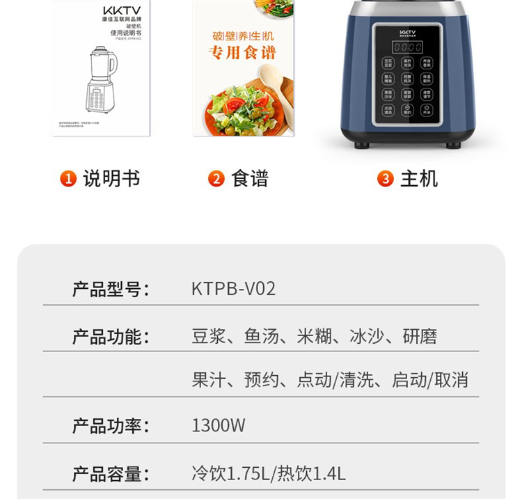 商品名称: KKTV KTPB-V02 1.75L 冷热双杯破壁机(单位:台)