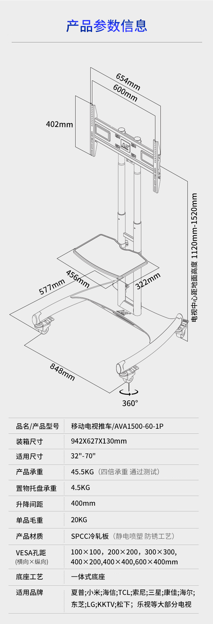 商品名称: NB AVA1500-60-1P 电视支架落地移动支架32-70英寸(单位:个)
