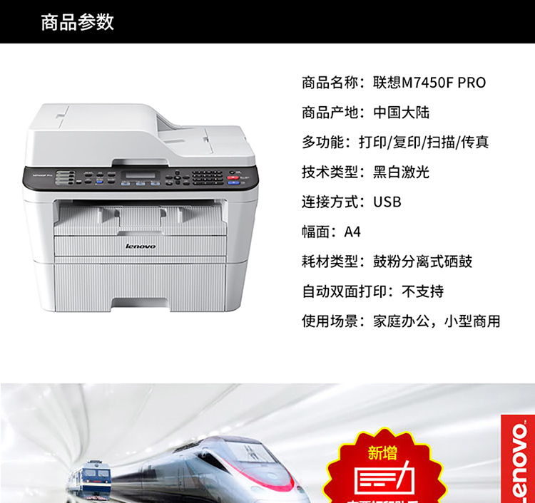 办公设备  > 打印/复印设备  > 激光打印机  >  膜法世家/Mask Family 1908  >  联想 M7450F Pro 激光多功能一体机(可调节分辨率HQ1200 600*600dpi/票打印/海报打印/多合一打印/页眉页脚打印/打印/复印/扫描/传真) (单位:台)